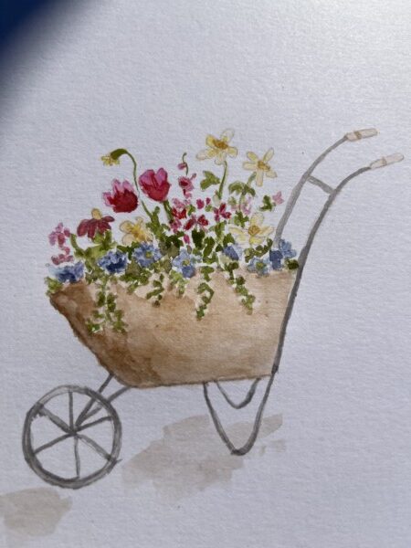 I have also stumbled into water coloring. I love the ones with flowers. There is some essential listening going on as I mix colors, add water and dab here and there on the paper. And it is also quiet inside. There is no story about the flowers, who owned them, what they meant to them, what they felt when they died. Just pure color and form. Here is my favorite one so far.